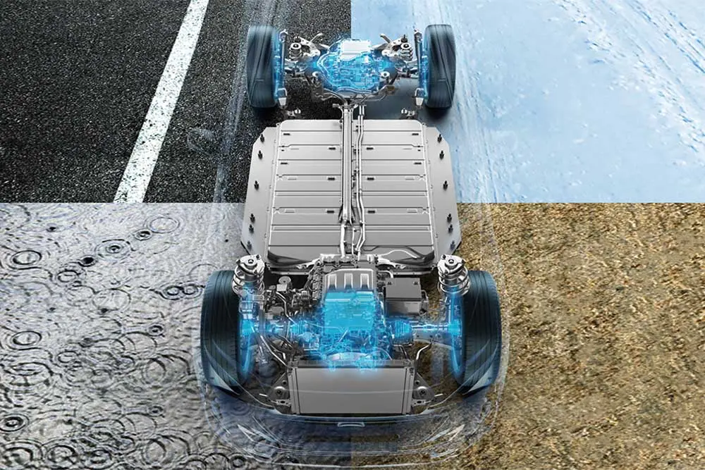 Solterra utmärker sig, tack vare 21 cm markfrigång och Subarus karaktäristiska styrka: den permanenta fyrhjulsdriften. I Solterra uppnås samma egenskaper genom två lika starka elmotorer, en som driver framhjulen och en som driver de bakre. Subarus greppassistent X-Mode blir mer effektiv tack vare den omedelbara kraftutveckling som är unik för elmotorer.